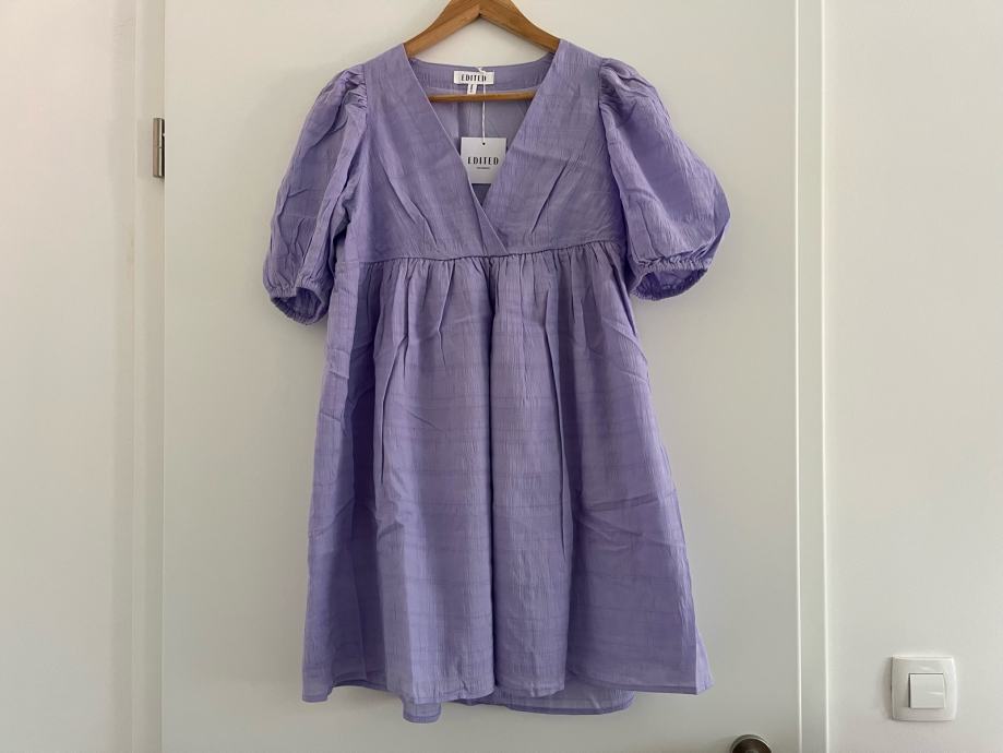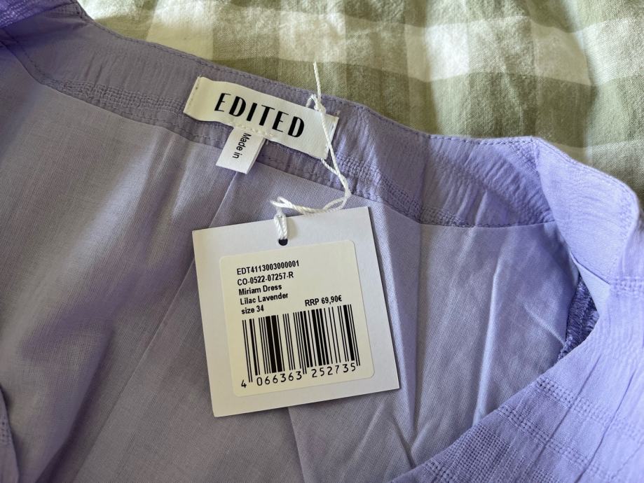 Nova oblekca znamke EDITED lepe lila barve, iz bombaža, dodaten spodnji sloj za večje udobje, rokavi na balonček, številka 34 - S, MPC 69,90 eur.