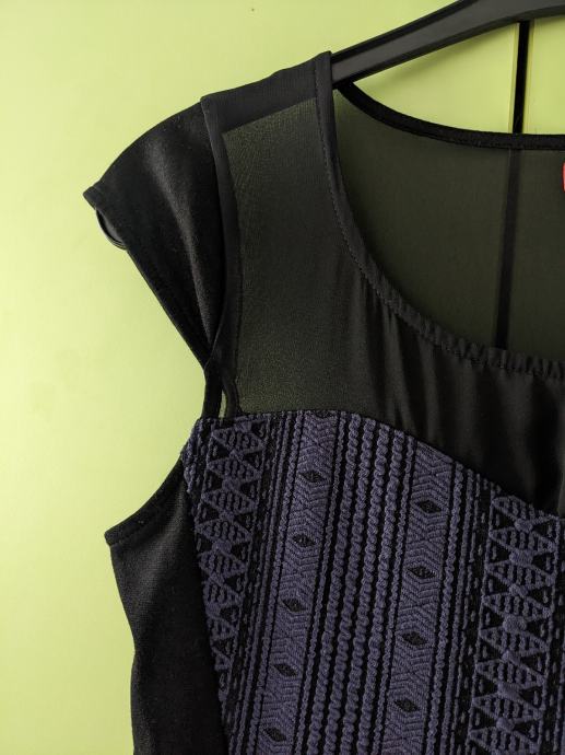 Lepo ohranjena, praktično skoraj nenošena, kombinacija temno modre in črne barve, obseg okrog prsi oziroma pod pazduho je 84cm s tem da se še dodatno raztegne, celotna dolžina pa je 92cm, sega nekje nad koleni