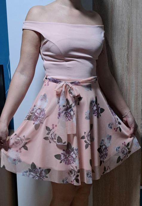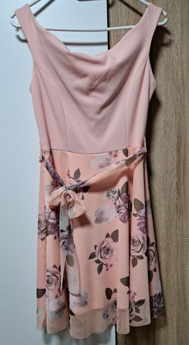 Kratka rožnata obleka s cvetličnim vzorcem. Elastičen material (viskoza in elastan), primeren za velikost S in M (36-38). Je lahka in udobna.