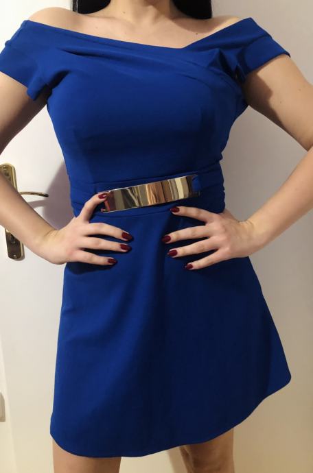 Prodam novo modro obleko z okrasnim zlatim paščkom.