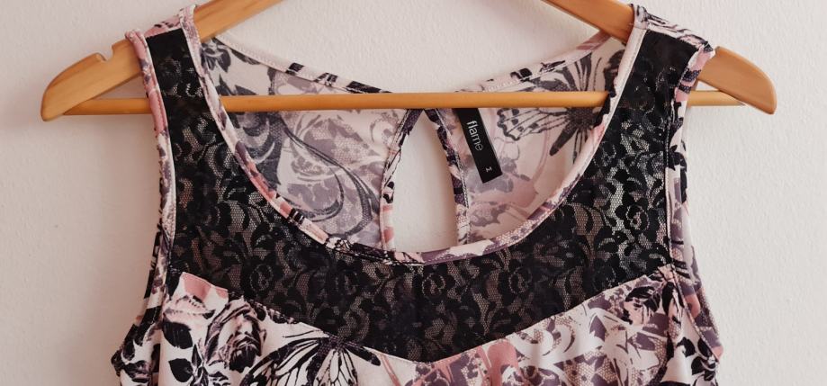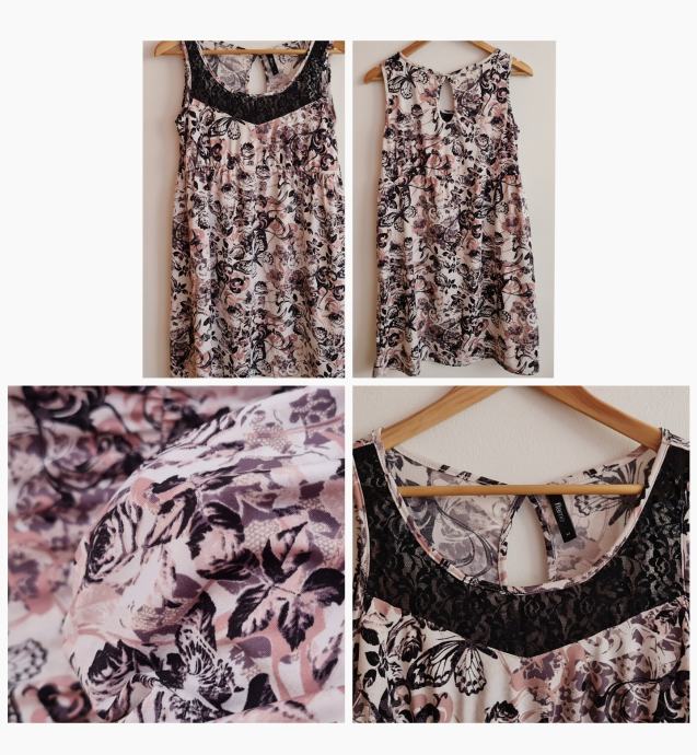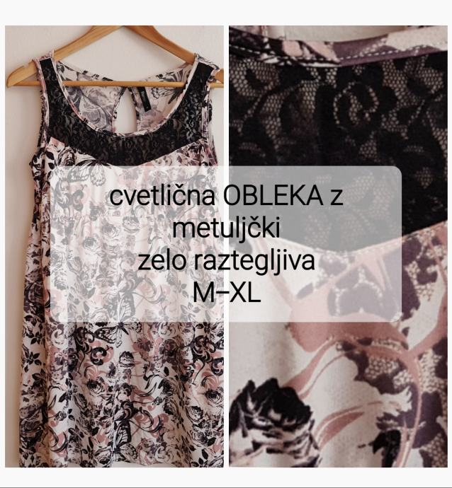 Luštna, simpaticna cvetlicna oblekica z metuljčki in malo čipke okrog ovratnika. Velikost primerna za M- XL, saj je zelo raztegljica in precej ohlapen model. Velikost drugačen označena kot M. Brezhibna.