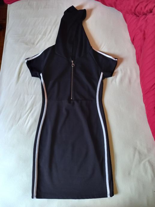 Ozka obleka s kratkimi rokavi, kapuco in zadrgo. Prilega se postavi.