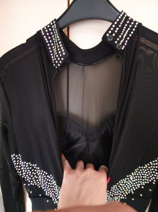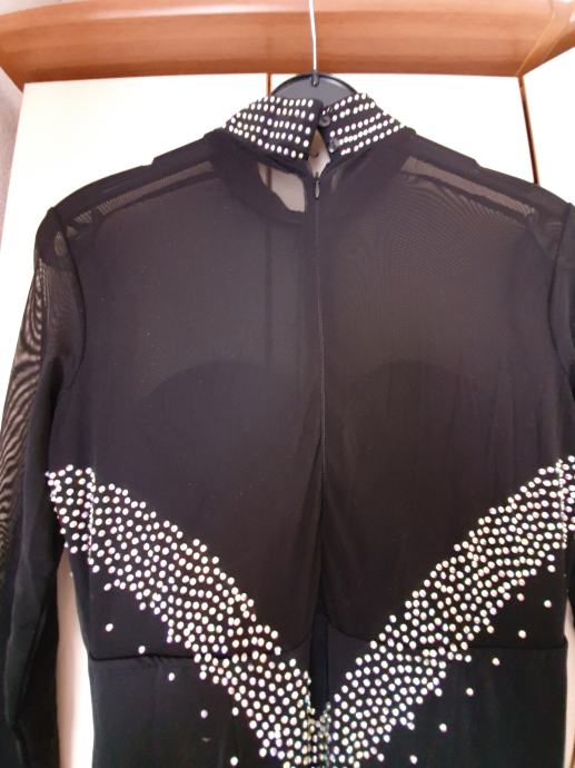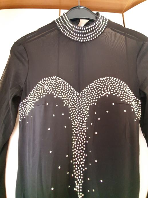Material: rahlo elastičen poliester spandex z bleščicami in resami, spodaj body, ki se zapne, da obleka ne leze, zračna, ni težka, super za ples.