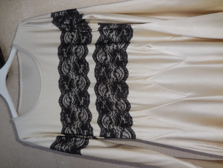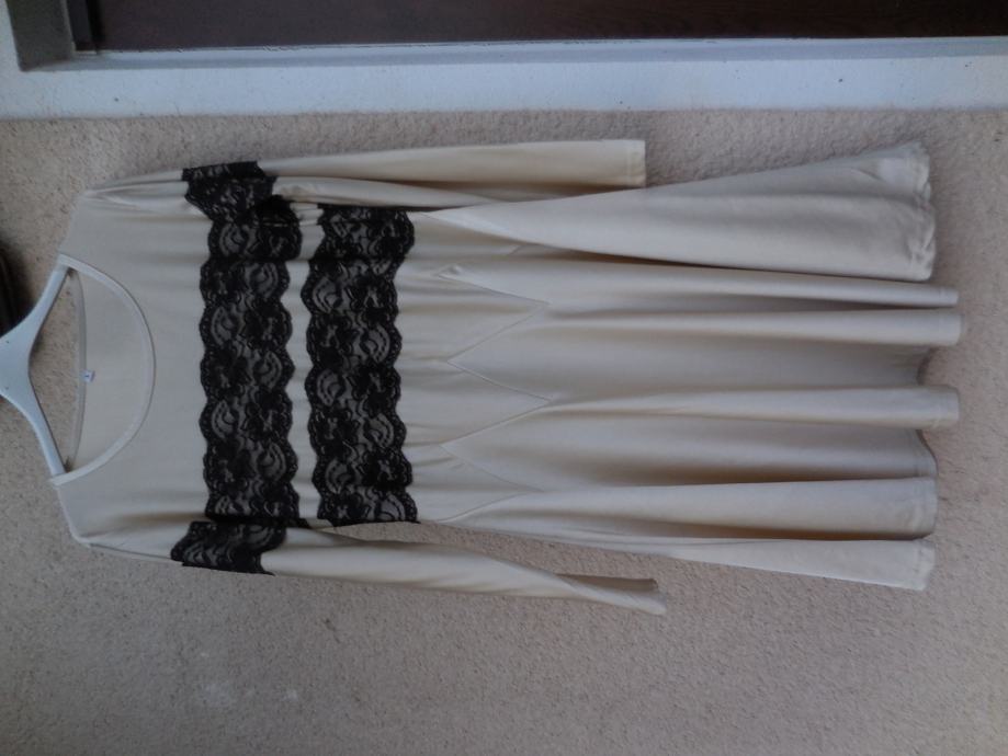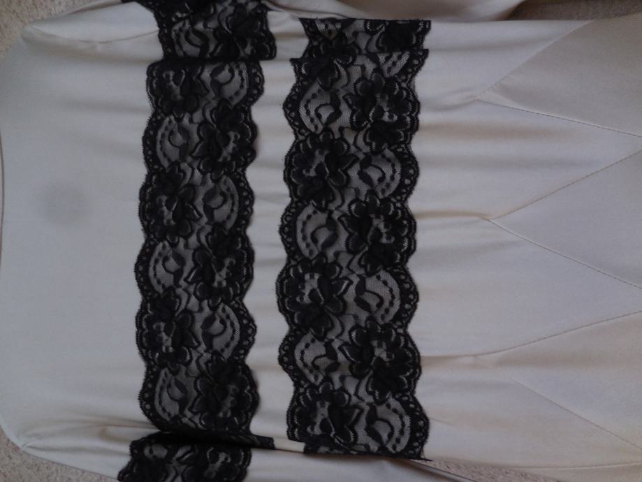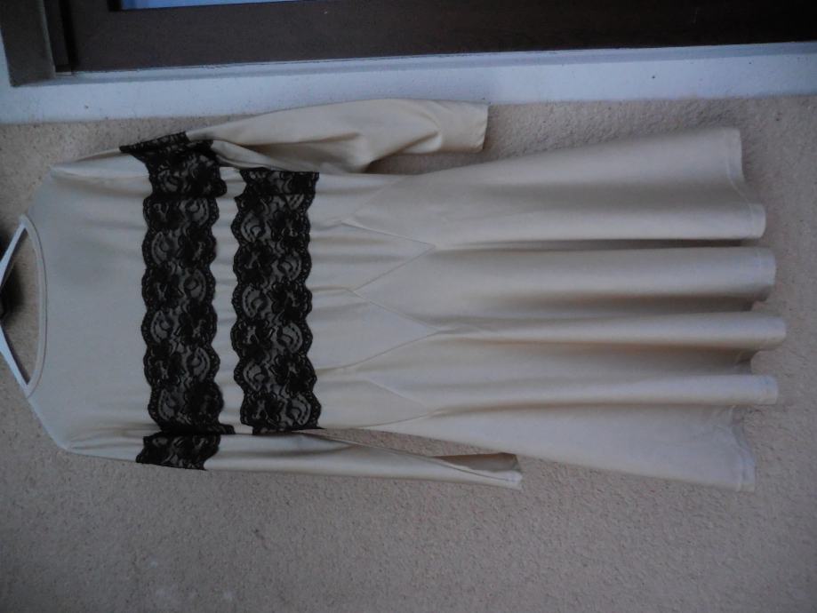 Nova skater obleka v barvi šampanjca s črno čipko. Obleka je raztegljiva, ni podložena. Dolžina je do kolen.