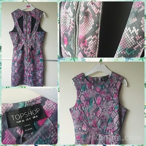 Prodam nikoli nošeno (samo oprana, nato pa je ostala v omari) kratko obleko Top Shop. Obleka je iz rahlo raztegljivega materiala z atraktivnim vzorcem in izrezi na hrbtu.