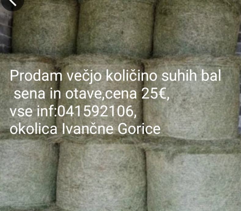 Prodamo kvalitetne suhe bale sena in otave,mrva ni košena v močvirju in ni gnojena z umetnimi gnojili,dostop možen s šleparjem,cena 25€,vse inf:041592106,prevzem med Ivančno Gorico in Trebnje(Bič)