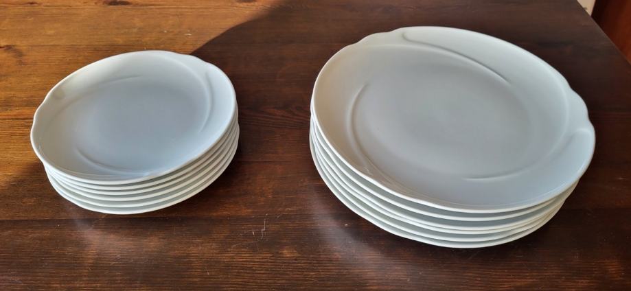 Prodam jedilni servis 6 velikih krožnikov in 6 desertnih krožnikov. Cena za posamezen krožnik je 2 EUR. Mali krožniki imajo premer 19 cm, veliki krožniki imajo premer 26 cm.