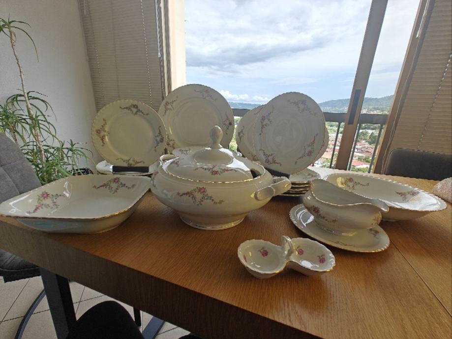 Na voljo je brezhibno ohranjen, nikoli uporabljen jedilni servis priznane češke porcelanske tovarne THUN. Gre za klasičen, elegantno oblikovan komplet iz finega porcelana, okrašen z nežnimi cvetličnimi motivi in ročno poslikano zlato obrobo.