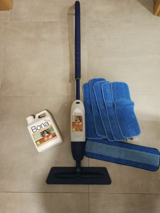 Prodam Bona Spray Mop pripomoček za čiščenje tal (oljen parket). Zraven je še ena original krpa in 5 nadomestnih ter nekaj čistila za oljen parket (cca polovica vsebnika).