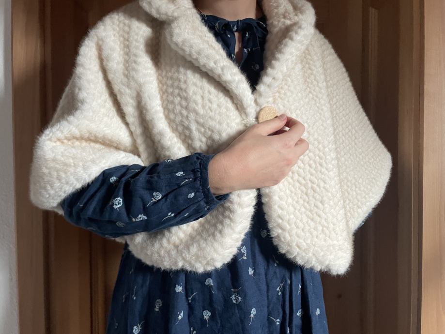 Prodam enkrat nošeno ogrinjalo iz umetnega krzna. Ogrinjalo je podloženo, ima en gumb in je brez znakov uporabe. Nošeno je bilo le na poročni dan, kupljeno aprila 2025 v enem od butikov v centru Ljubljane.