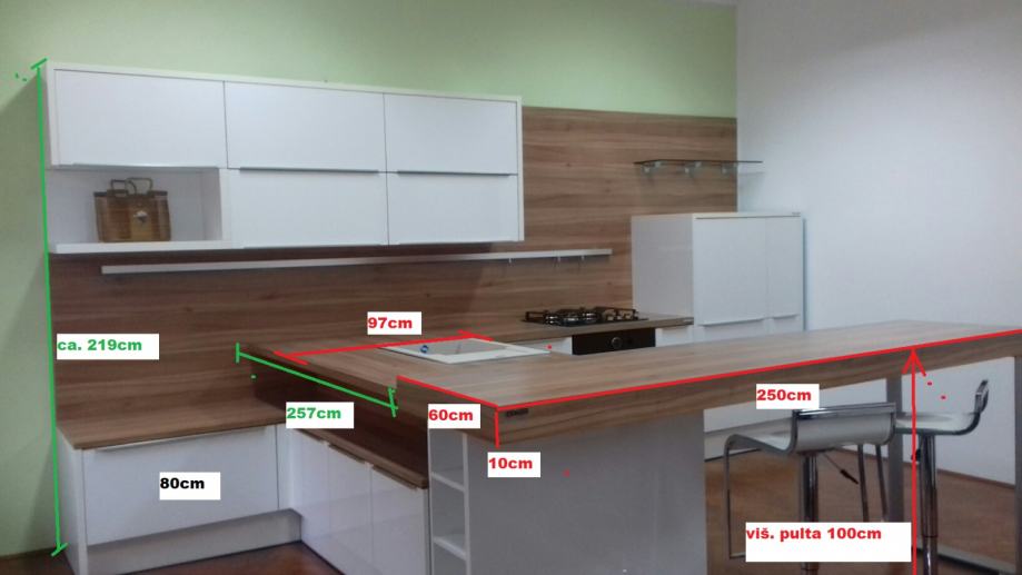 Robovi so zaščiteni z abs folijo 2mm. Mere so: 437 celotna širina x 274 cm (do konca šanka ) in dodatno šank 250x60cm.