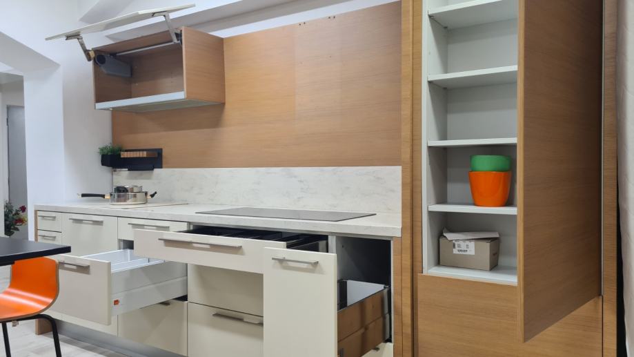 V prodaji je razstavni eksponat kuhinjskega niza (30+60+60+90+30+60) v kombinaciji hrastovega furnirja, pulta in sp.dela stenske obloge iz Coriana ter front iz lakiranega mediapana. Dimenzije sestava 350 x 64 x 203,5 cm. Visoka omarica ima plitvejši notranji korpus. Viseča omarica z dvižnimi vratci s steklenim dnom in napeljavo za svetilko.