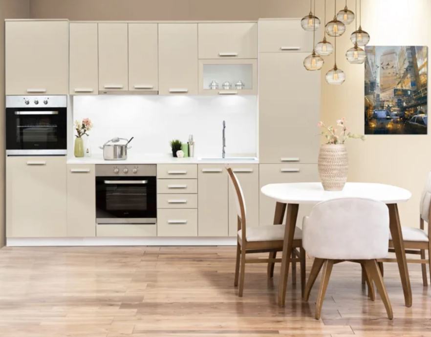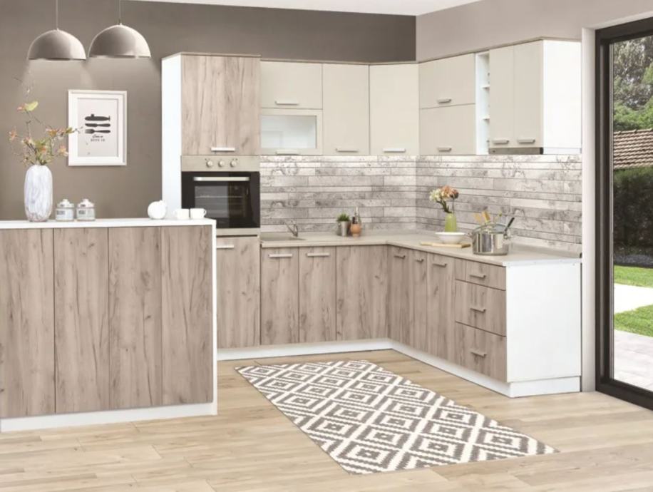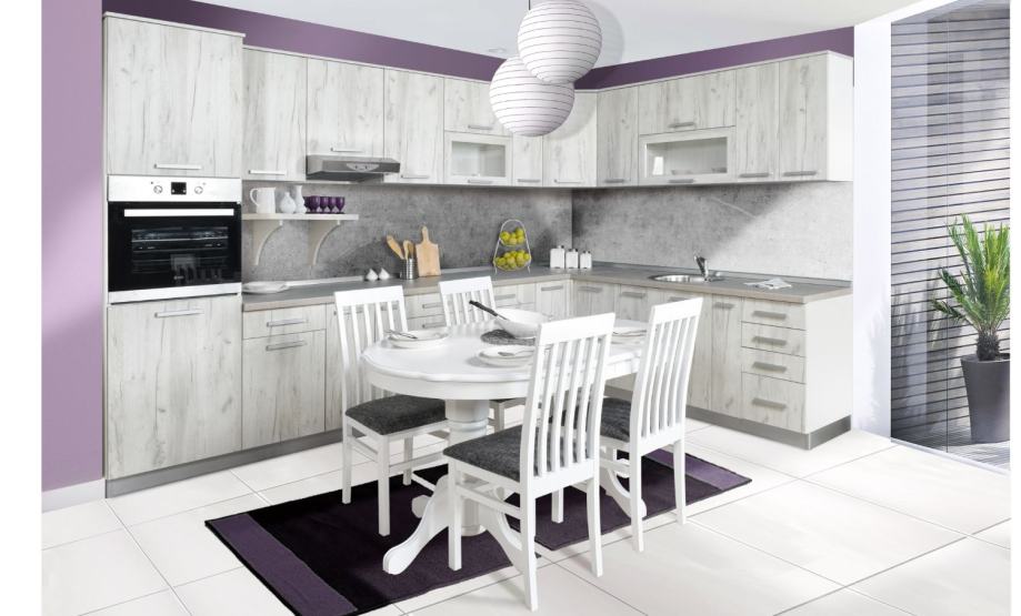 Kuhinja z preprostimi linijami, na voljo v barvah: snežni hrast, sivi hrast, artisan, antrcit in pesek mat. Vsa vrata imajo tiho zapiranje, predali pa klasična vodila ali pa mehanizme s tihim zapiranjem (PL-BOX pri oznaki elementa.