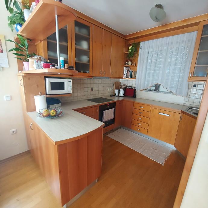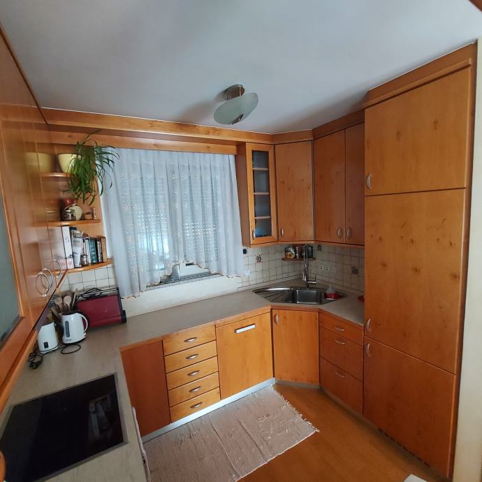 kuhinja tlorisno štirje kraki, zunanja velikost (od Leve proti Desni): 140+280+285+200cm, višina pulta 90cm, višina zg. omaric 110cm, jelša furnirano, cena 300€, vsak kos bele tehnike (indukcijska plošča, pečica, pomivalni stroj) +70€, hladilnik z zmrzovalnikom +120€