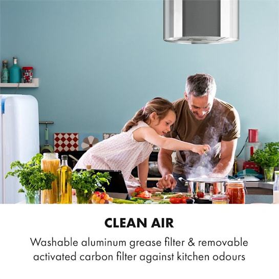 V borbo s hlapi in neprijetnimi vonjavami v kuhinji: otočna napa Klarstein Beretta prinaša v kuhinjo sijaj in odstranjuje zračne pare ter neprijetne vonjave.