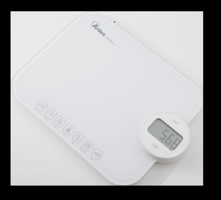 Elegantna digitalna kuhinjska tehtnica ENERGA, Površina iz kaljenega stekla, Enostavna za uporabo, Tehtnica ne potrebuje baterij, Napajanje z zasukom vrtljivega gumba, Merjenje kilokalorij za 7 živil, Funkcija tare, Merjenje tekočin, Avtomatski izklop, Nosilnost do 5 kg.