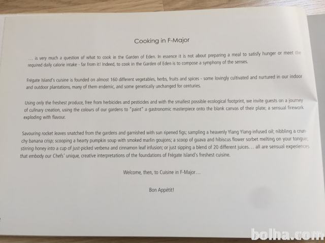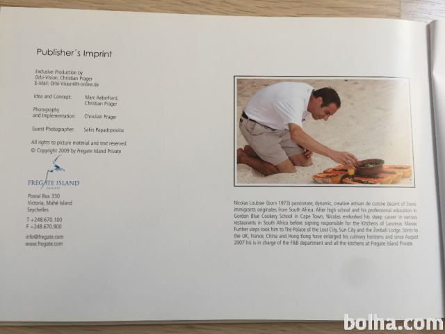Prodam kuharsko knjigo Fregate Island private Cooking in F-Major,knjiga vsebuje moderno pripravo ter recepte razlićnih jedi