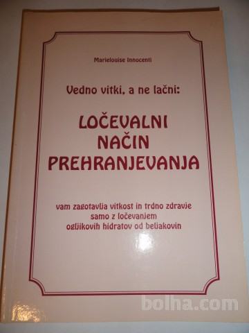 Knjiga LOČEVALNI NAČIN PREHRANJEVANJA VAM ZAGOTAVLJA VITKOST IN TRDNO ZDRAVJE SAMO Z LOČEVANJEM OGLJIKOVIH HIDARTOV OD BELJAKOVIN, vedno vitki,a ne lačni,MARIELOUISE INNOCENTI, Tomark 2000, broširana, 141 strani, lepo ohranjena.