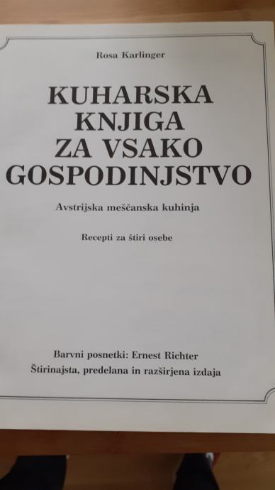 Prodam Kuharsko knjigo za vsako gospodinjstvo - avstrijska meščanska kuhinja, avtorica Rosa Karlinger, trda vezava. Recepti so za 4 osebe. Knjiga je zelo lepo ohranjena. Cena 20 eur. Prevzem možen po dogovoru tudi v Ljubljani, Kamniku ali Domžalah. Info. na tel.: 031 763 786.