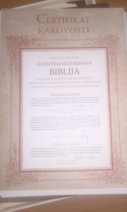 Razkošna ilustrirana Biblija z več kot 1000 stranmi formata 220 x 310 mm je vezana v usnje in ima zlato obrezo. Pred poškodbami jo varuje po meri narejena usnjena škatla. Tisk z zlato barvo in vrhunska strojna vezava, certifikat kakovosti.