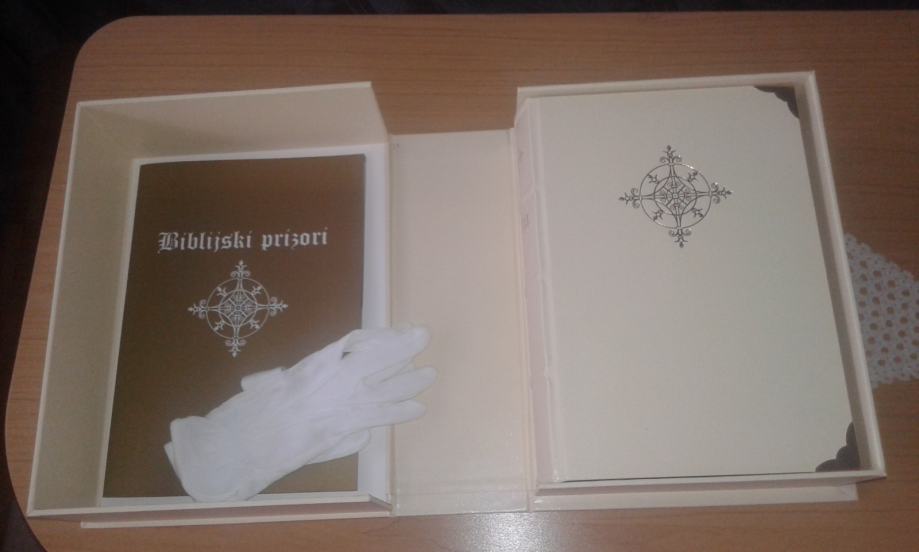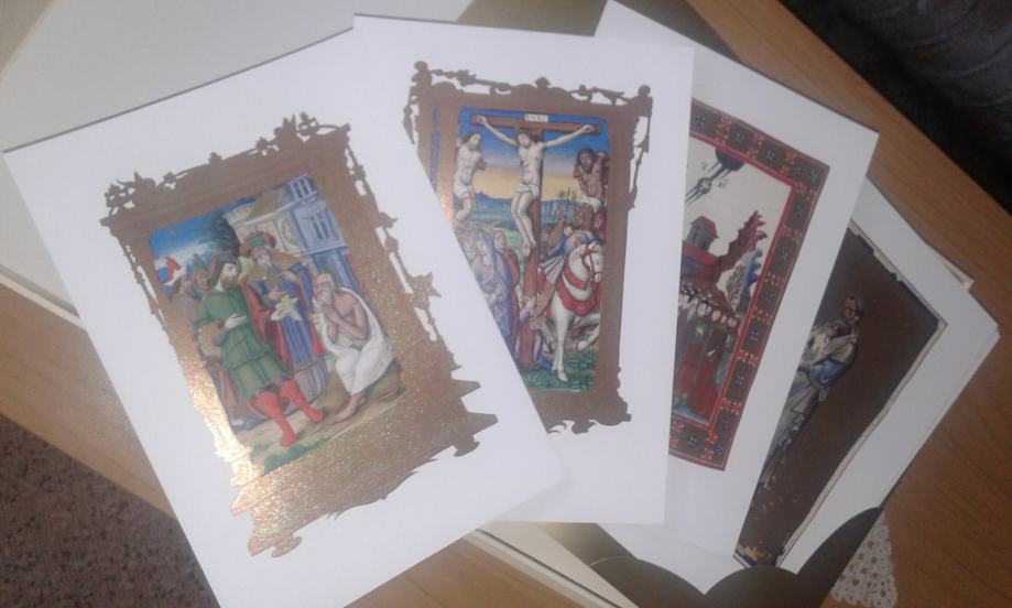 Darilo: bele rokavičke, komplet 8 reprodukcij biblijskih iluminacij, okrašenih z zlato folijo.
