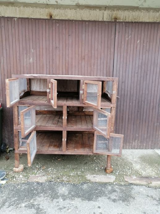Kletka za zajce v treh nivojih. Prvi in drugi nivo imata 2 kletki (81 X 90 cm), tretji nivo tri kletke (54 X 90 cm). Streha pločevina, zadnja stena pločevina z luknjicami. Cela kletka je impregnirana, v vsaki kletki so jasli za seno. Mere kletke :višina 156 cm, širina 162 cm, globina 90 cm. Cena. 330€. Tel 041 824 593