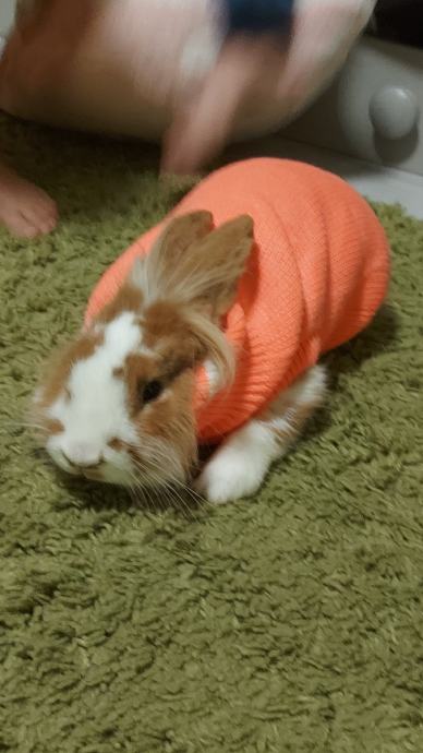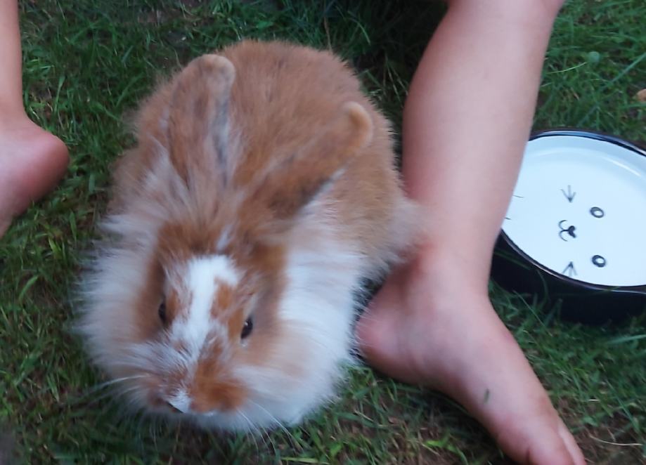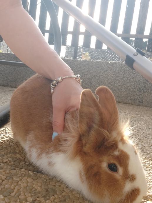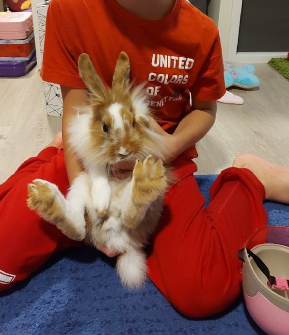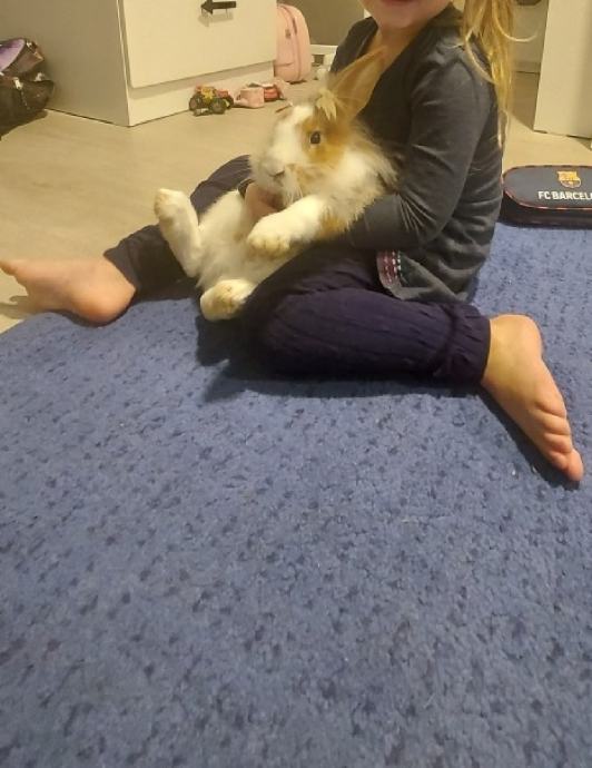 Oddamo zajcka. Vajen rokovanja. Je kot naš hišni pes. V ograji se prosto sprehaja. Priteče k tebi ko prideš domov.