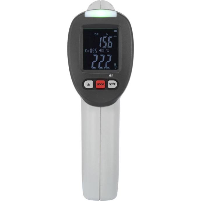 Inverzni prikaz številk (svetleče številke)Možnost aktivacije dvojnega laserjaPrikaz temperature, vlažnosti zraka in rosiščaPrikaz v barvah semaforja ob približevanju rosiščuPreklapljanje med °C/°FOsvetljen prikazovalnikSamodejni izklopFiksna stopnja emisije: 0,95.Tehnični podatkiMerilno območje rosišča: -30 do +100 °CMerilno območje vlažnosti zraka: 0–100 % rel. vl.Dodatni tehnični podatkiMerilno območje rosišča: -30 do +100 °CMerilno območje vlažnosti zraka0–100 % rel. vl.KalibriranoTovarniški standardi (lastni)Ločljivost (temperatura)0.1 °CMera, dolžina168 mmMera, višina58 mmMera, širina82 mmNatančnost (plus/minus)1.5 %Nivo emisij (maks.)0.95Nivo emisije (min.)0.95Optični termometer20:1Oskrba z napetostjo9 V blok baterijaOsnovna točnost (plus / minus) ° C2 °CStopnja emisije0.95Temperatura (maks.)+380 °CTemperatura (min.)-50 °CTeža163 gVrsta izdelkaInfrardeči termometerZnačilnosti termometra s sondoPirometer, Skener rosišča