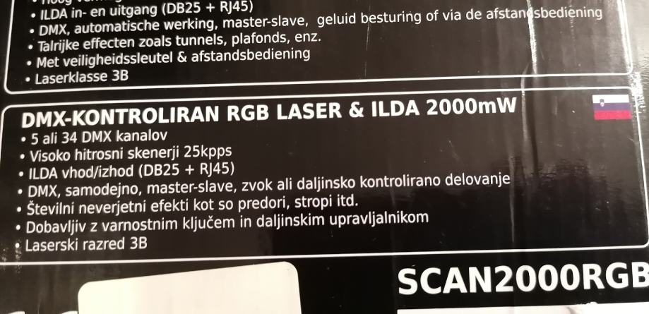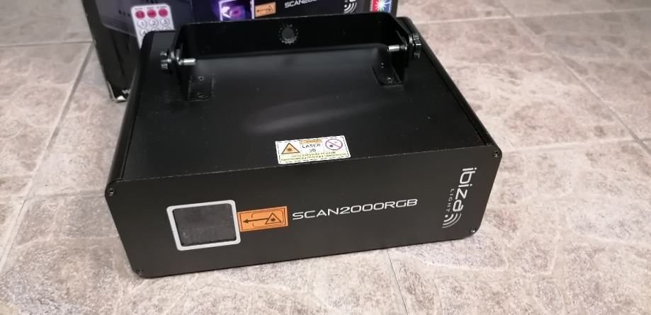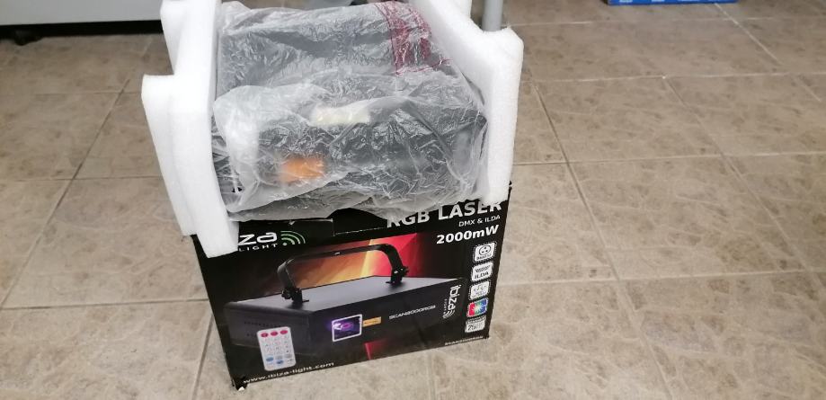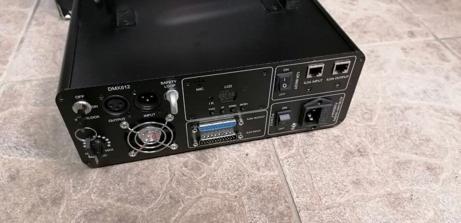 Zelo malo rabljen v show-room, brezhiben grafični laser, moč 2W (2000mW), hitri skenerji 25 KPPS, 3 barvni RGB, DMX, ILDA, daljinec...