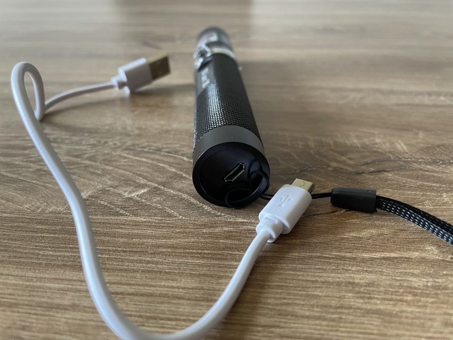 V kompletu je laser; snemljiv nastavek, ki snop razprši, USB polnilni kabel.