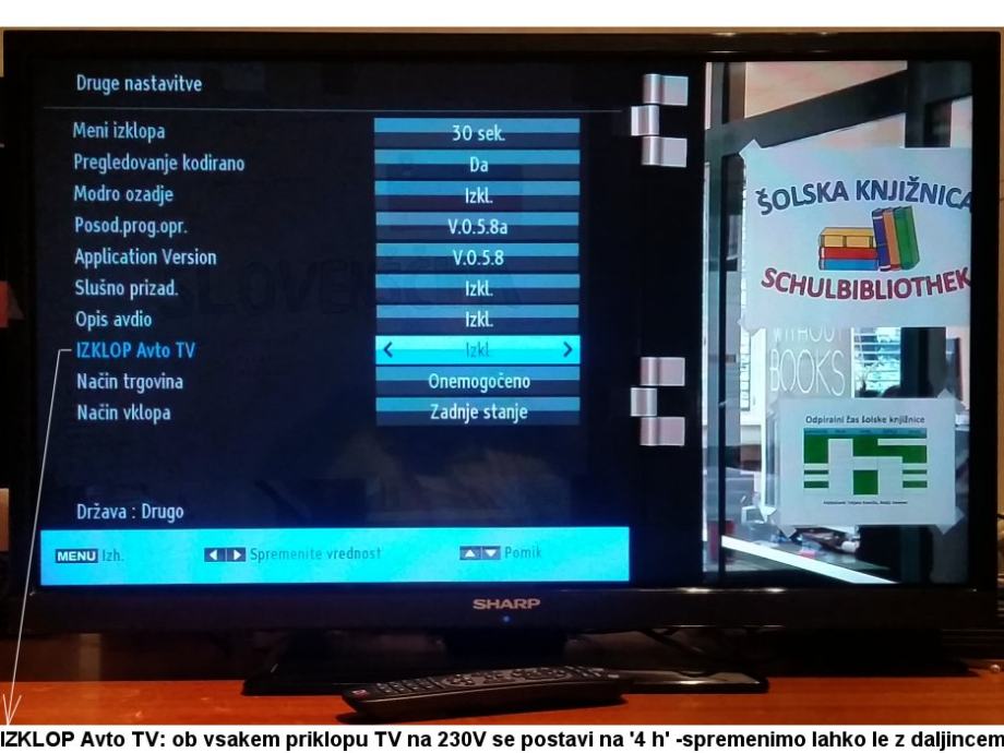 Pridržan gumbek (daljši pritisk) izklopi TV (gre v stand-by).