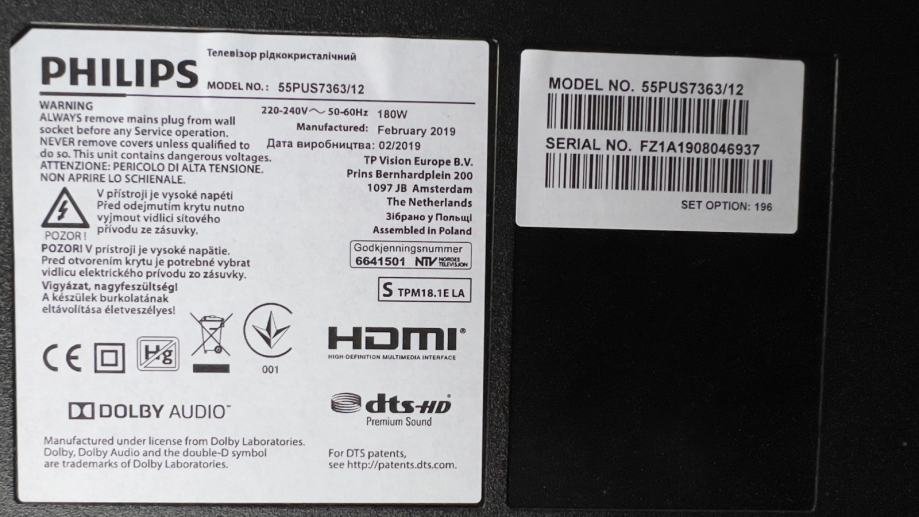 Prodam rabljene rezervne dela za TV Philips 55PUS7363/12, FZ1A, 13552-