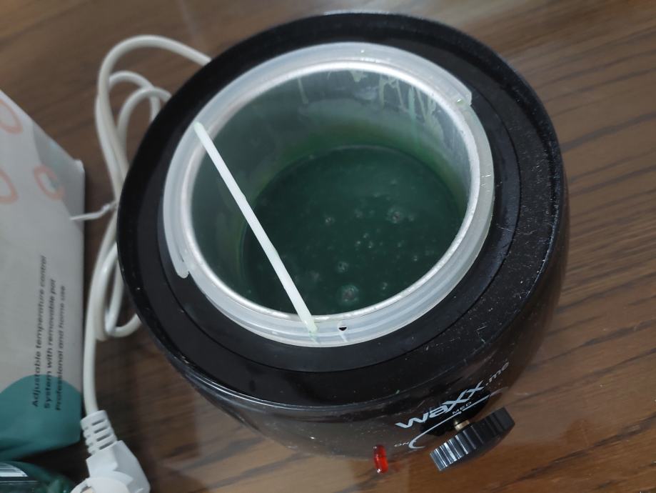Odlično ohranjen oziroma praktično nov aparat za toplenje voska in pa vosek za depilacijo.