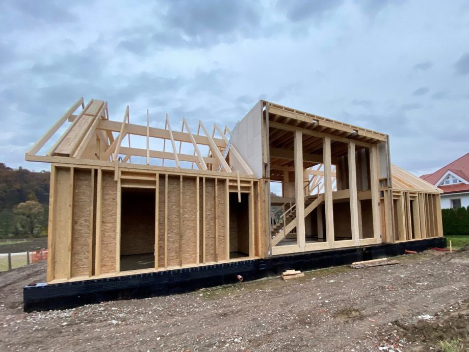 - "dobava z montažo" - je dodatna opcija, kjer vam pripravljeno konstrukcijo tudi zmontiramo na gradbišču, običajno zgolj "leseni del"