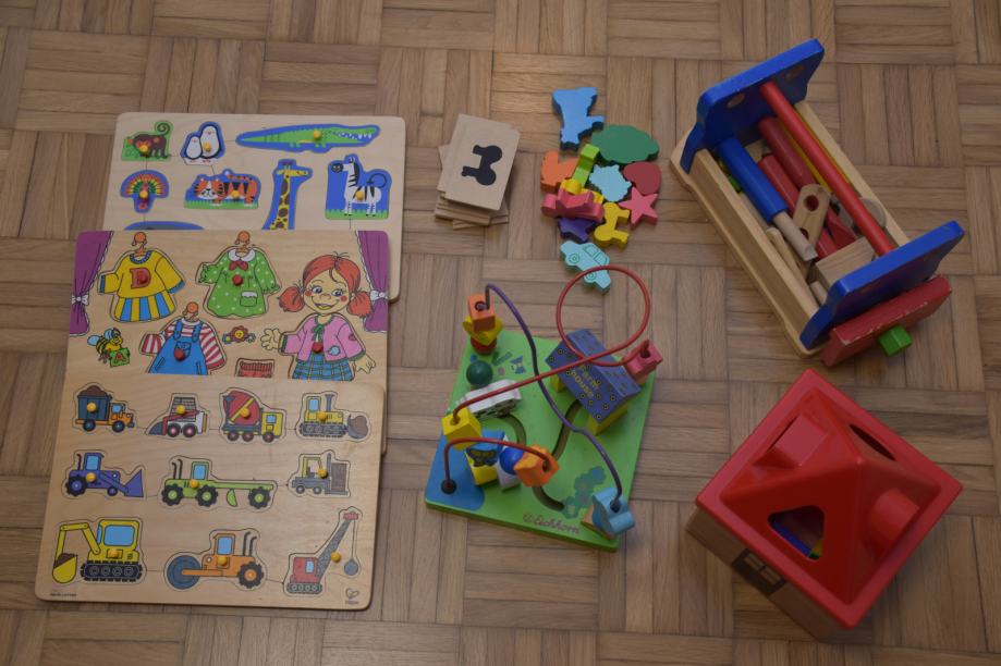 Prodam komplet lesenih igrač - vstavljanke, delavnica, labirint, hiška z oblikami... Vse je rabljeno, a ohranjeno. Ena od vstavljank je porisana, jo podarim zraven. Cena za komplet 35 eur.