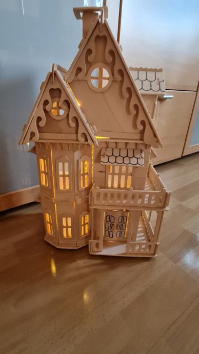 Lesena hiška z osvetlitvijo kot nova za igranje s punčkami, legicami