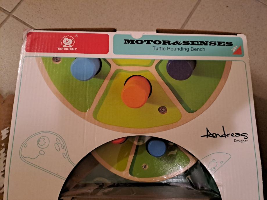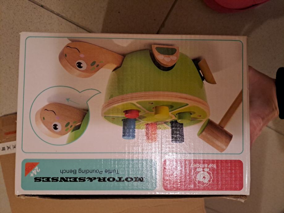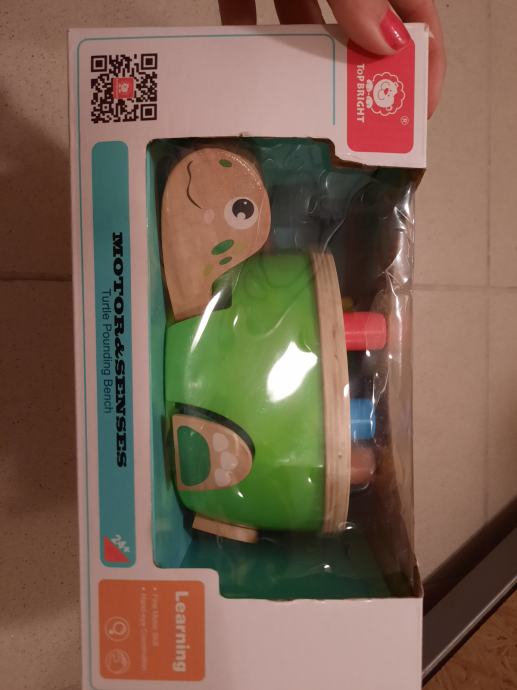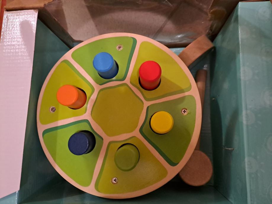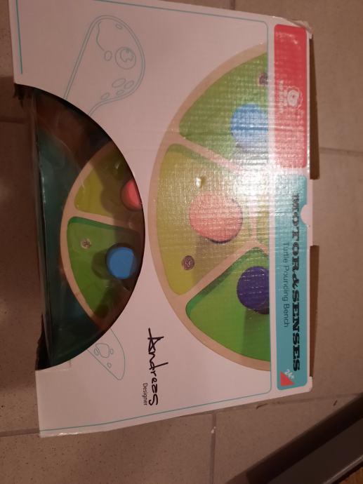 Zaradi neuporabe prodamo leseno igračo v obliki želvice. Priloženo ima kladivo s katerim otork potiska na različne barve gumbov (ki se nahajajo na želvinem hrbtu).