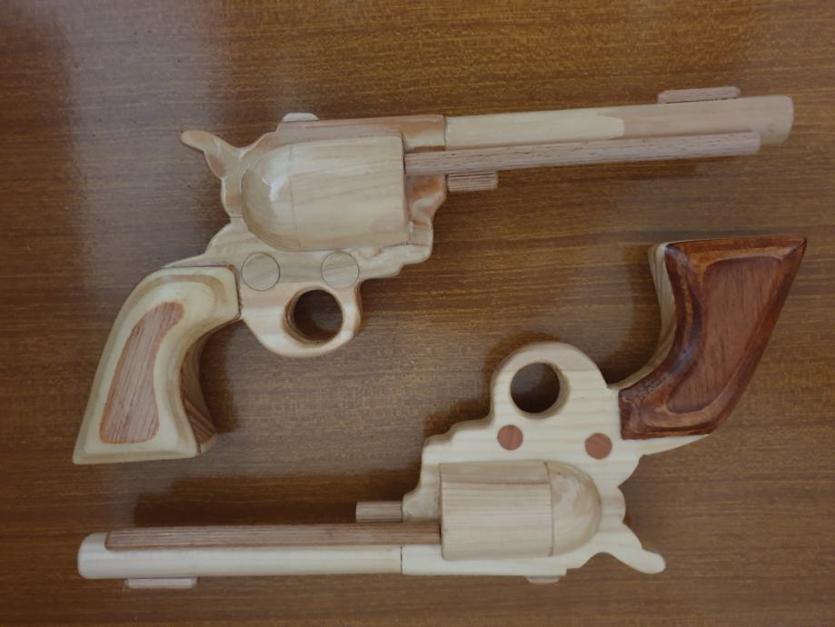 Revolverji narejeni iz lesa, pobarvani in lakirani z sijajnim lakom. Nekaterim se vrti bobnič. Tel.- 070 739 107