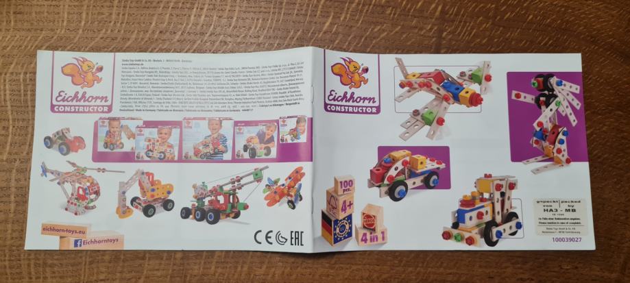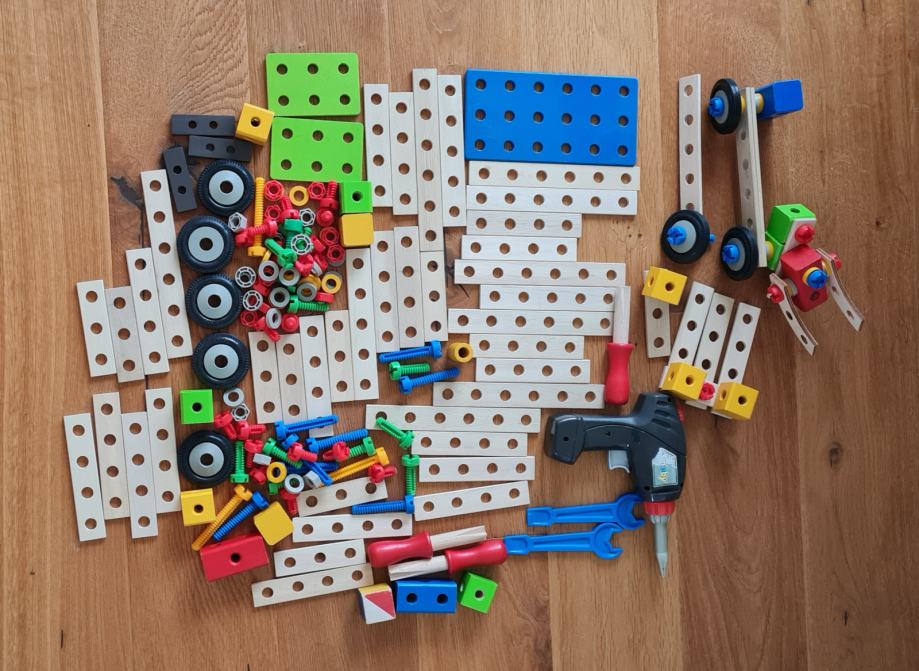 Montažne kocke in spojke so izdelane iz lesa, vijaki in kolesa so izdelani iz trdne plastike. S setom lahko otroci sestavili kar nekaj odličnih modelov – navodila priložena.