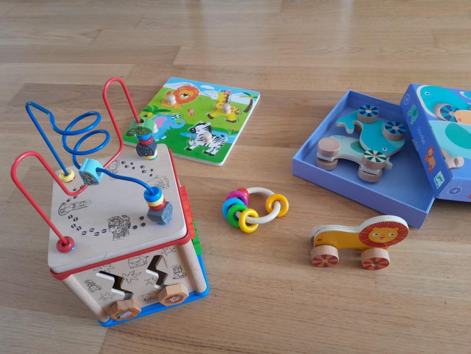 Prodam malo rabljene lesene igrače: ropotuljica (malo rabljena), večfunkcijska igrača (malo rabljena, malo počečkana), živali na kolesih (zelo malo rabljeno) in sestavljanka (nerabljena). Prevzem možen v Ljubljani.