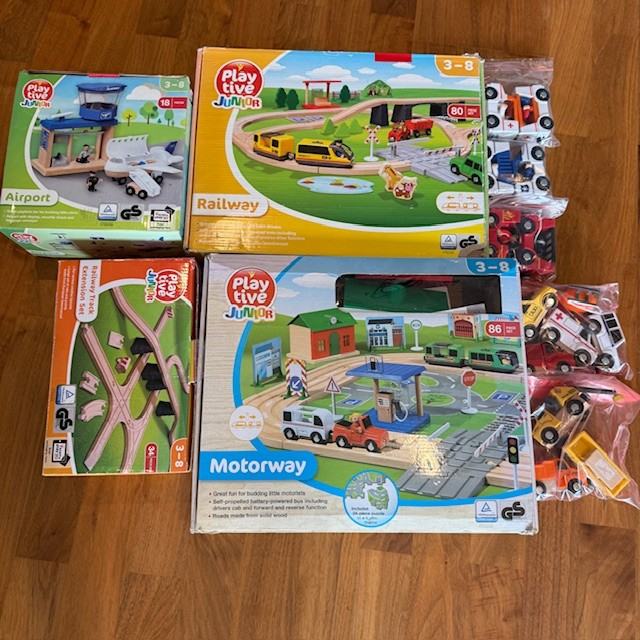 Prodam otroško kompleti železnic (railway, motorway,airport in extension set) - igračo in več drugih igrač s fotografij. Cena velja za komplet