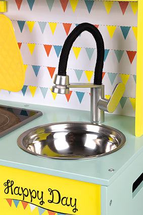 Janod Happy Day je prekrasna lesena kuhinja v rumenih in mint odtenkih s sivimi poudarki. Otroška kuhinja Happy Day je tradicionalna igrača vendar sodobnega dizajna s preprostimi in sodobnimi ravnimi linijami. Otroci bodo radi kuhali v svoji mali kuhinjici, ki je ravno prave višine.
