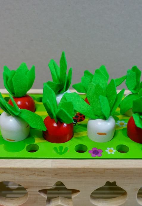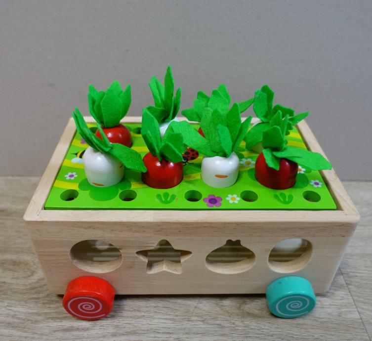 Zgornja plošča ima luknjice za leseno zelenjavo, 8 kos.