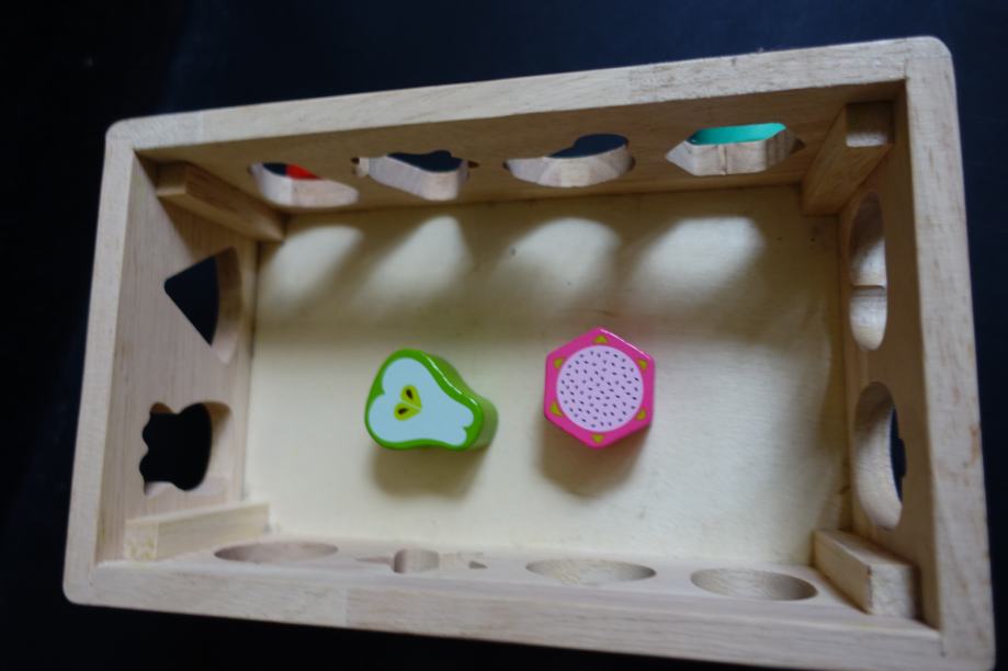 Ob strani vozička so luknjice v različnih oblikah za različne lesene kocke, žal pa se jih je pri selitvi precej igubilo tako da sta samo še jagoda in hruška, drugače pa vse lepo ohranjeno in brezhibno.