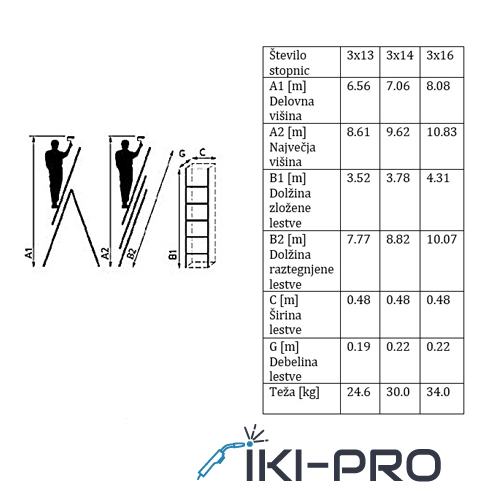 • Aluminijasta lestev 3x14 ustreza standardu EN 131 in je certificirana s strani TÜV Rheinland, kar potrjuje njeno kakovost in zanesljivost.