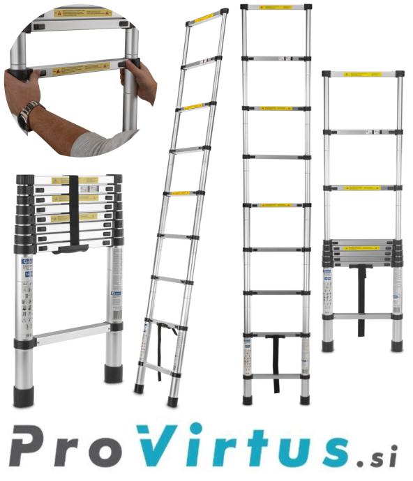 Aluminijasta teleskopska lestev je vrsta lestve, ki je strukturno zložljiva in raztegljiva, kar omogoča prilagoditev njene dolžine po potrebi.