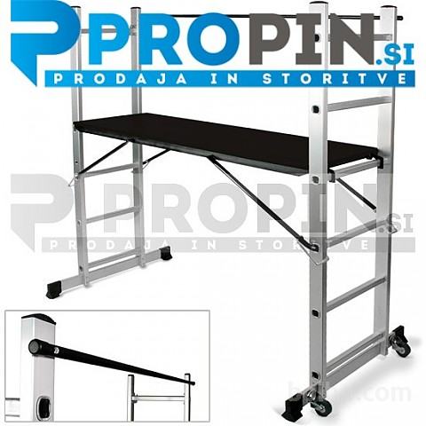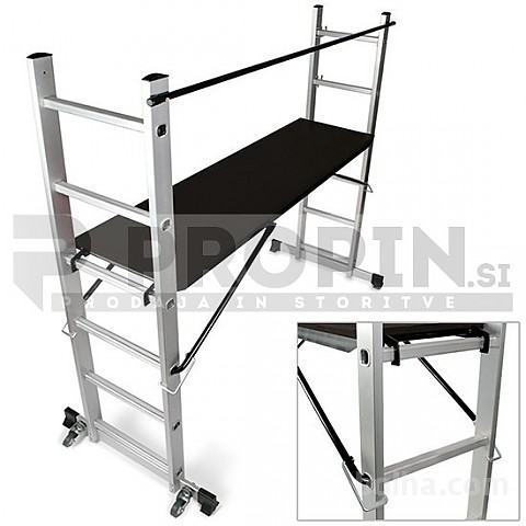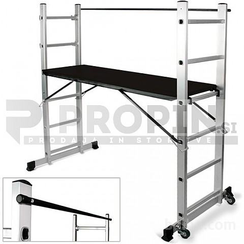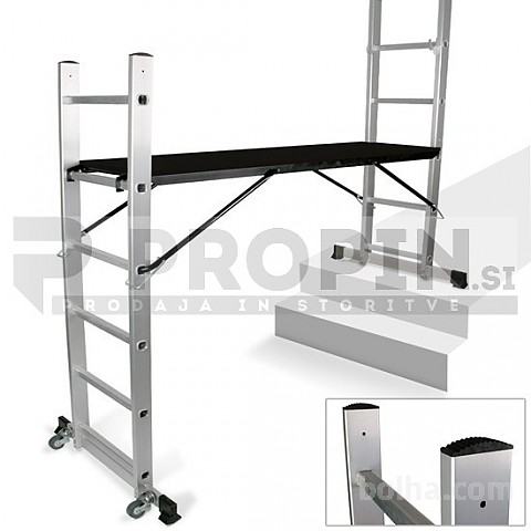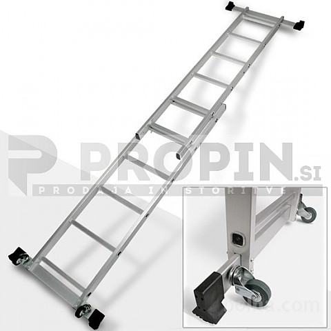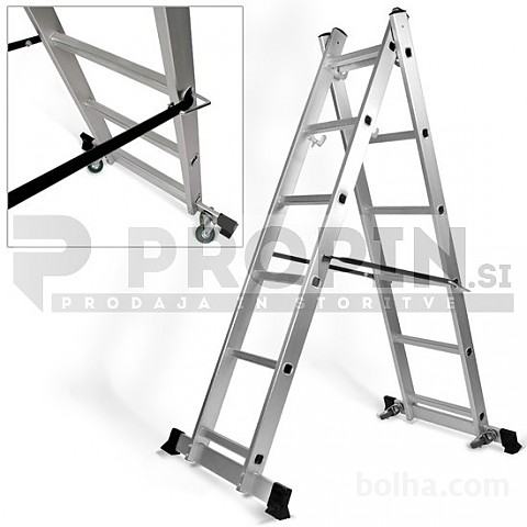 Univerzalna lestev iz aluminija idealna za dela okoli hiše, vrta ali delavnice. Z nekaj preprostimi koraki imate lestev ali oder. Robustni materiali za nosilnost do 150Kg. Vključena kolesa za lažje prestavljanje.