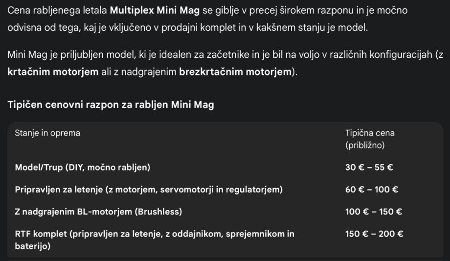 Prodam rabljen Multiplex Mini Mag pripravlien za letenje (z motorjem, servomotorji in regulatorjem) ter z nadgrajenim BL-motorjem (Brushless).