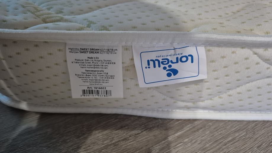 Prodam približno 2 leti staro vzmetnico (v uporabi je bila kakšno leto in pol), ker smo jo prerasli. Dimenzije vzmetnice: 62x110x10cm. Cena: 30€