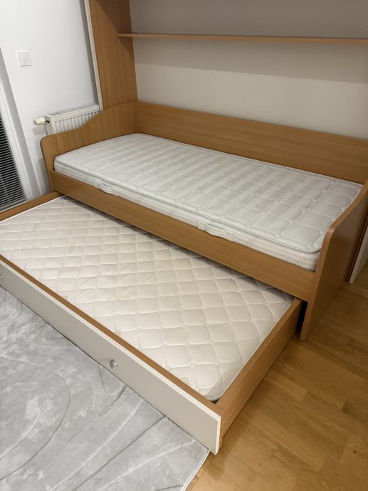 Prodamo enojno posteljo 90x200cm z dodatno izvlečno posteljo, ki nudi dodatno ležišče za goste mere 80x190cm. Barva: bela/natur. Zraven sta oba posteljna dna oz. letvena dela. Zraven še 2x kot nov Dormeo jogi (dimenzije 200x90 in 190x80 cm). V kompletu tudi most z visečimi omaricami nad posteljo (dolžina 205 cm, višina 230cm). Izdelano po meri pri mizarju (masiva). Dobra rešitev za manjši prostor, goste in počitniške kapacitete. Prevzem možen v Kranju.